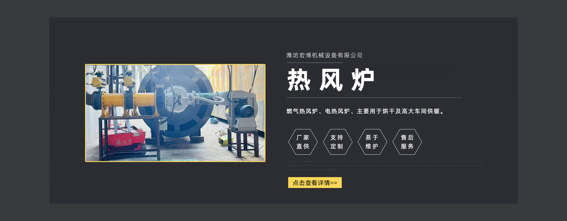 濰坊宏博機(jī)(jī)械設(shè)(shè)備有限公司是從事熱風(fēng)(fēng)爐、烘干設(shè)(shè)備、供暖設(shè)(shè)備的研發(fā)(fā)、設(shè)(shè)計(jì)(jì)、制造和服務(wù)(wù)于一體的實(shí)(shí)體企業(yè)(yè)。長(zhǎng)(zhǎng)期以來,企業(yè)(yè)以市場(chǎng)(chǎng)的發(fā)(fā)展和客戶的需求為導(dǎo)(dǎo)向,集多年的生產(chǎn)(chǎn)技術(shù)(shù)與經(jīng)(jīng)驗(yàn)(yàn)為一體,不斷開發(fā)(fā)和優(yōu)(yōu)良產(chǎn)(chǎn)品。
